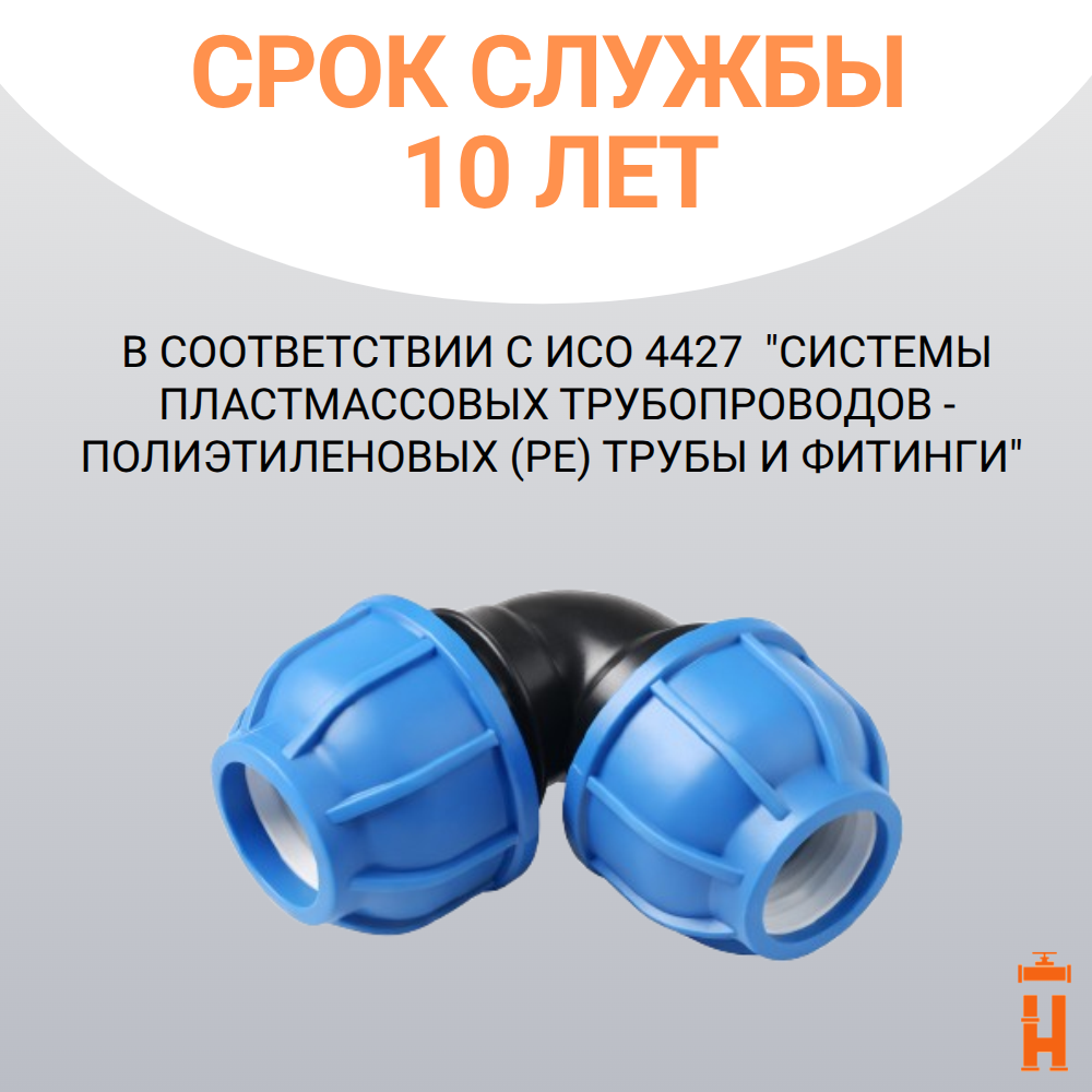 Компрессионные отводы Dy 20 мм — фитинг для присоединения труб ПНД в местах изгиба трубопровода. Сфера применения: водопроводы питьевого и технического назначения, системы орошения, капельного полива и другие системы, работающие в условиях неагрессивных сред при температуре рабочей среды до +40 °С и давлении 16 атмосфер.